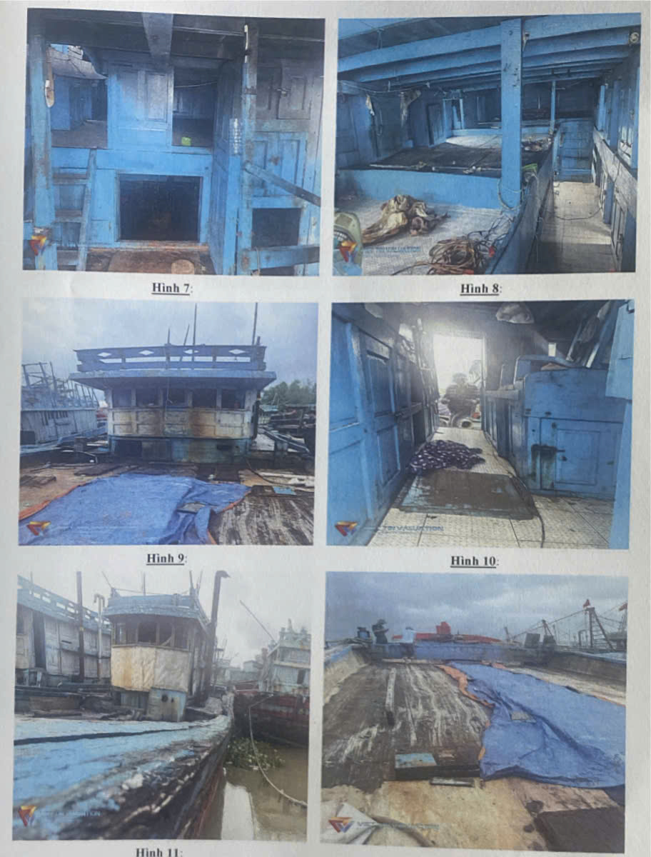 Hiện trạng tàu cá: Tàu cá đã qua sử dụng, các thông số kỹ thuật không thay đổi, thân, vỏ tàu bằng gỗ, một số vị trí trên tàu gỗ bị mục, tróc sơn, nội thất xuống cấp, cũ. Các thiết bị tàu đã rỉ sắt. Đối với máy tàu: đúng kiểu máy (loại máy): WEICHAI, số máy bị mờ không nhìn thấy được, không kiểm tra được hoạt động bên trong máy. Tại thời điểm kê biên, tàu cá chỉ còn thân, vỏ tàu, máy chính (không còn chân vịt, trục chân vịt). Ngoài ra, trên tàu không có trang thiết bị, ngư lưới cụ và tài sản nào khác. Tàu cá đã dừng hoạt động từ tháng 01/2025 đến nay.