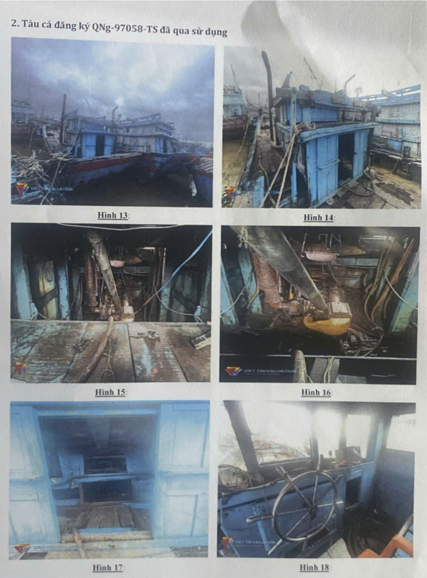 Hiện trạng tàu cá: Tàu cá đã qua sử dụng, các thông số kỹ thuật không thay đổi, thân, vỏ tàu bằng gỗ, một số vị trí trên tàu gỗ bị mục, tróc sơn, nội thất xuống cấp, cũ. Các thiết bị tàu đã rỉ sắt. Đối với máy tàu: đúng kiểu máy (loại máy): WEICHAI, số máy bị mờ không nhìn thấy được, không kiểm tra được hoạt động bên trong máy. Tại thời điểm kê biên, tàu cá chỉ còn thân, vỏ tàu, máy chính (không còn chân vịt, trục chân vịt). Ngoài ra, trên tàu không có trang thiết bị, ngư lưới cụ và tài sản nào khác. Tàu cá đã dừng hoạt động từ tháng 01/2025 đến nay.