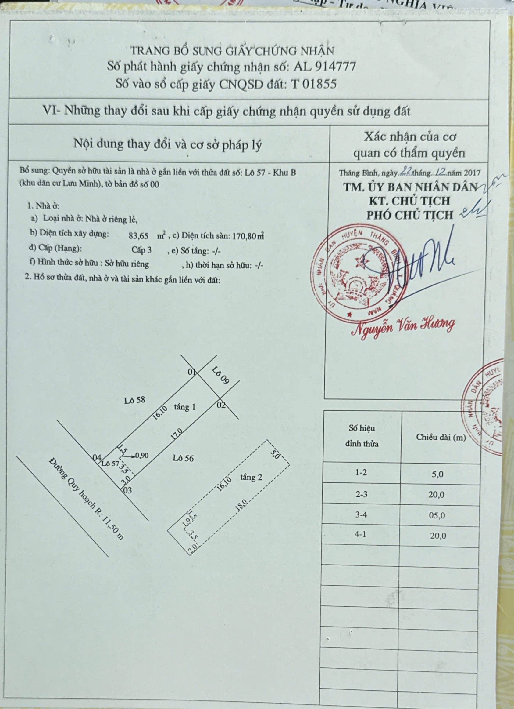 - Tài sản 1: Quyền sử dụng đất và nhà ở tại thửa đất số: Lô 57-Khu B (Khu dân cư Lưu Minh), tờ bản đồ số: 00. Địa chỉ: Tố 8, thị trấn Hà Lam, huyện Thăng Bình, tỉnh Quảng Nam thuộc sở hữu của ông Nguyễn Văn Bình - bà Nguyễn Thị Huyền Vân theo Giấy chứng nhận quyền sử dụng đất số AL 914777 do UBND tỉnh Quảng Nam cấp ngày 16/4/2009. Số vào sổ cấp giấy chứng nhận quyền sử dụng đất: T01855.