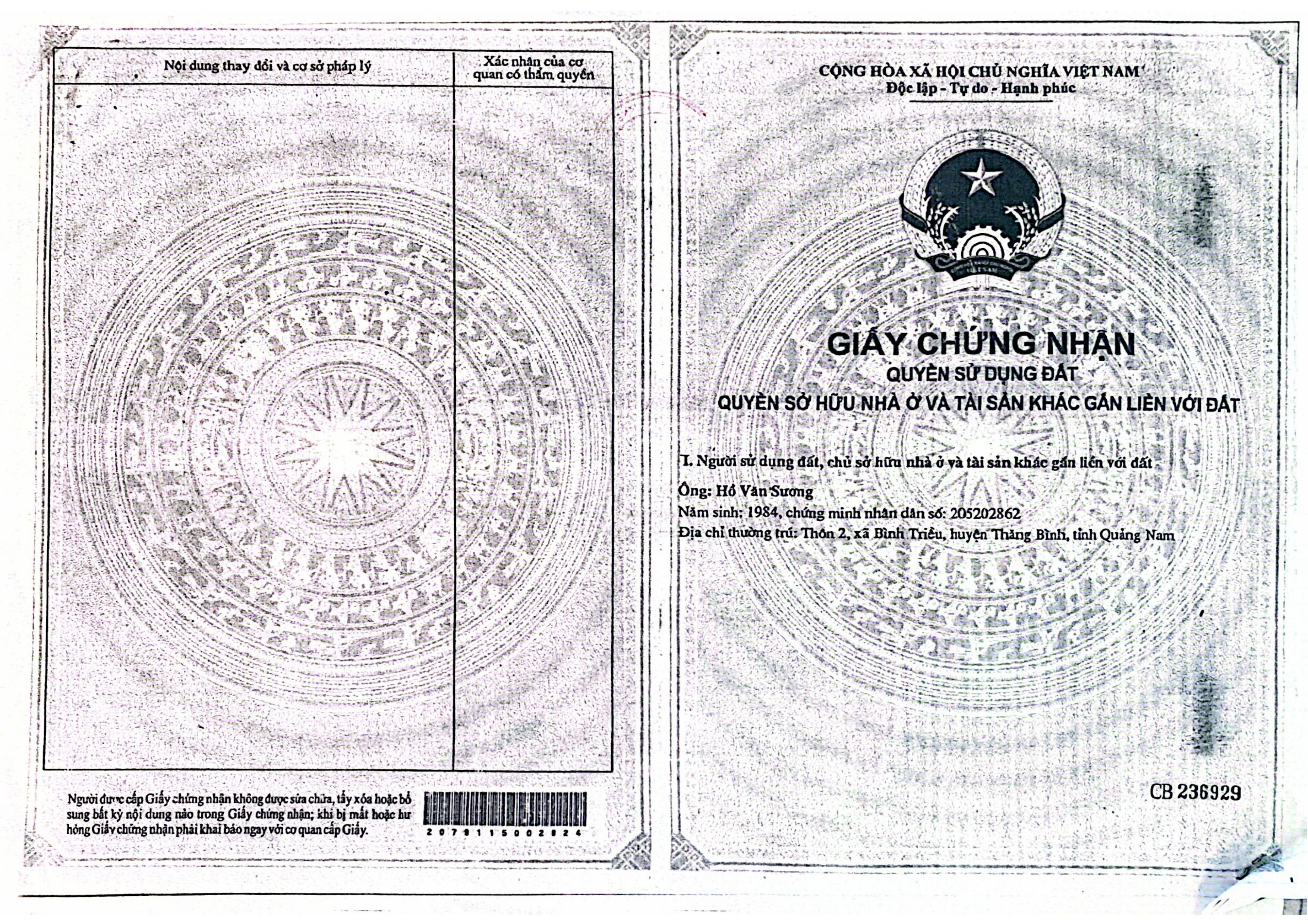 - Tài sản 2: Quyền sử dụng đất và nhà ở tại thửa đất số: Lô 57-Khu B (Khu dân cư Lưu Minh), tờ bản đồ số: 00. Địa chỉ: Tố 8, thị trấn Hà Lam, huyện Thăng Bình, tỉnh Quảng Nam thuộc sở hữu của ông Nguyễn Văn Bình - bà Nguyễn Thị Huyền Vân theo Giấy chứng nhận quyền sử dụng đất số AL 914777 do UBND tỉnh Quảng Nam cấp ngày 16/4/2009. Số vào sổ cấp giấy chứng nhận quyền sử dụng đất: T01855.