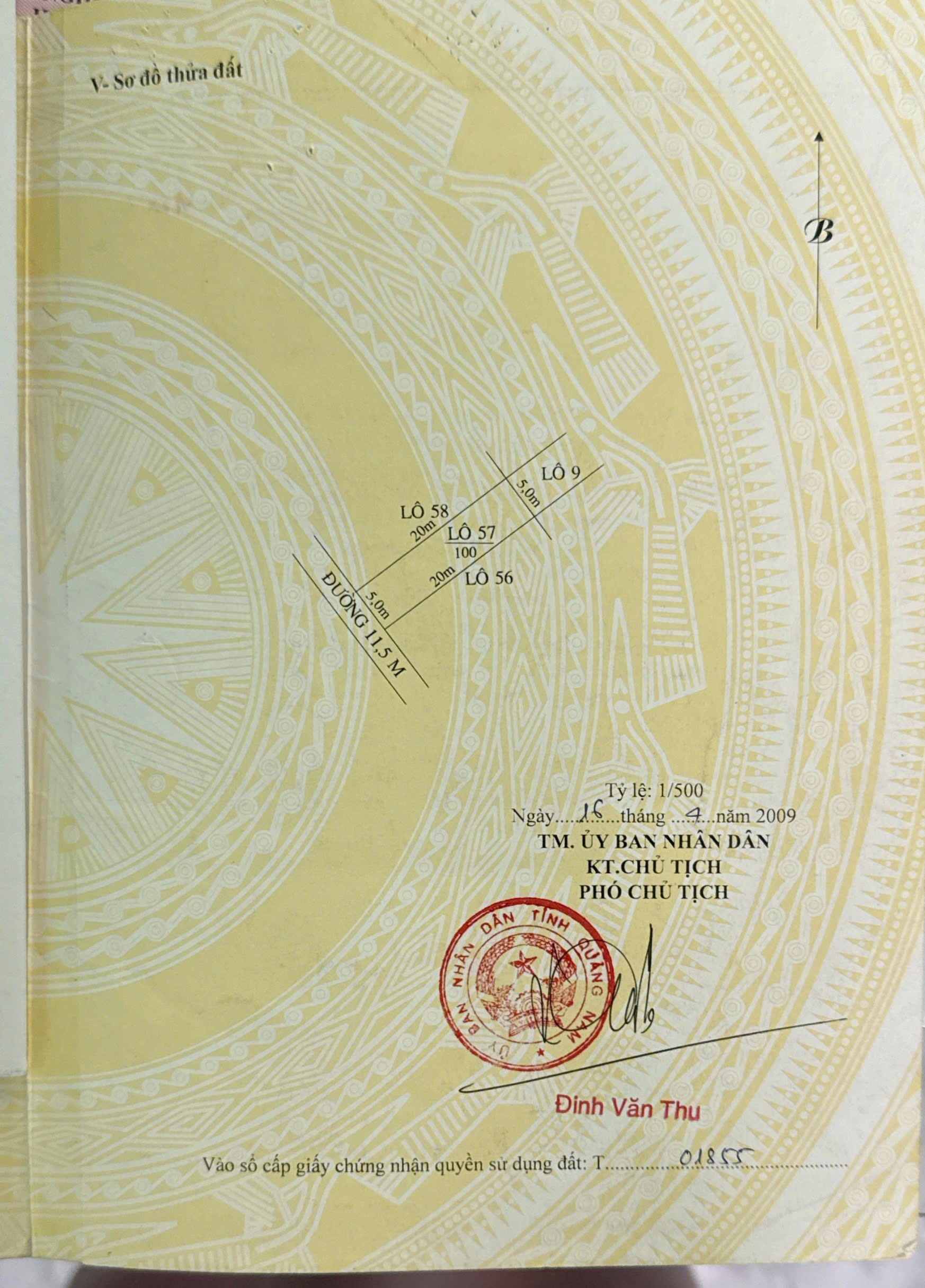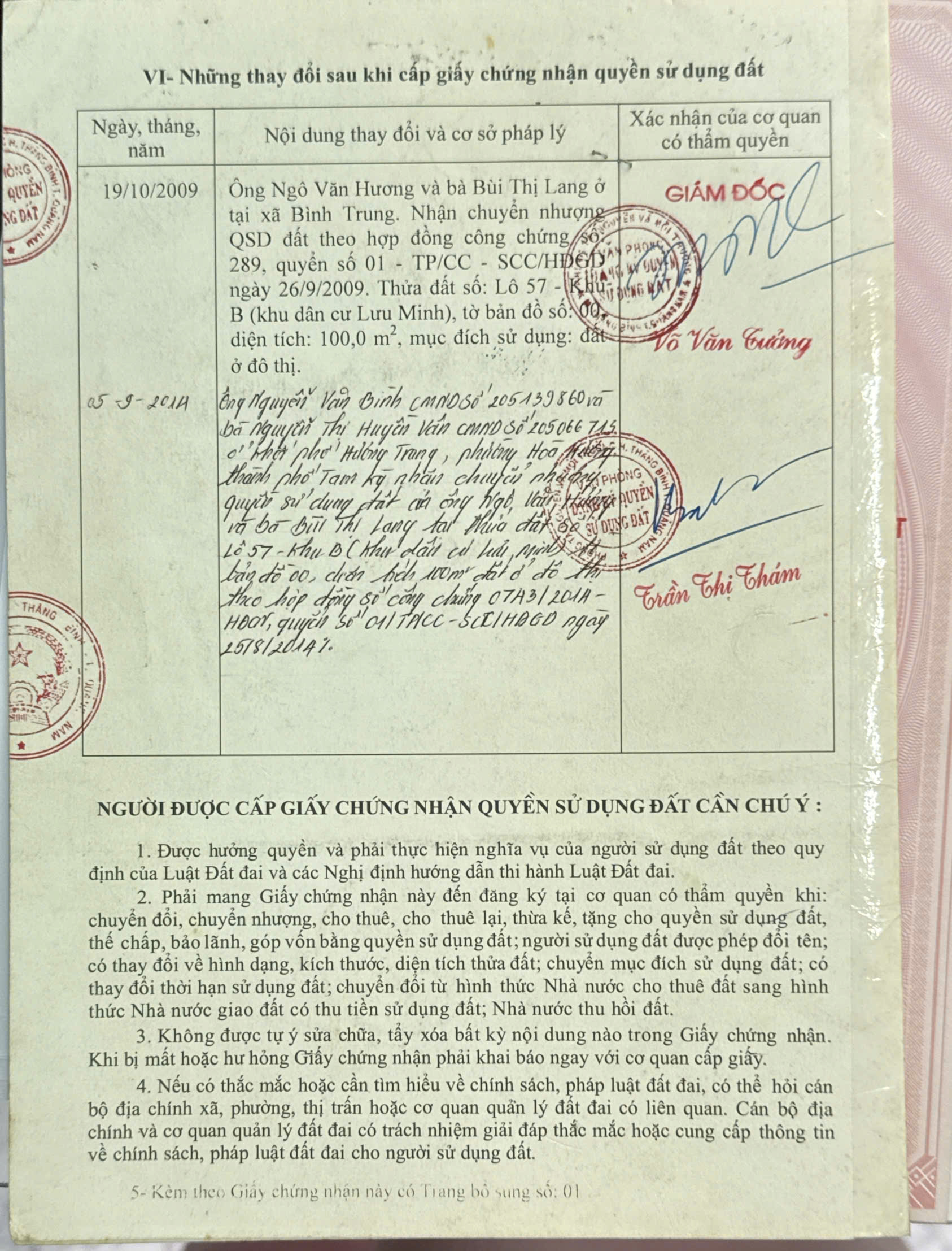 - Tài sản 1: Quyền sử dụng đất và nhà ở tại thửa đất số: Lô 57-Khu B (Khu dân cư Lưu Minh), tờ bản đồ số: 00. Địa chỉ: Tố 8, thị trấn Hà Lam, huyện Thăng Bình, tỉnh Quảng Nam thuộc sở hữu của ông Nguyễn Văn Bình - bà Nguyễn Thị Huyền Vân theo Giấy chứng nhận quyền sử dụng đất số AL 914777 do UBND tỉnh Quảng Nam cấp ngày 16/4/2009. Số vào sổ cấp giấy chứng nhận quyền sử dụng đất: T01855.
