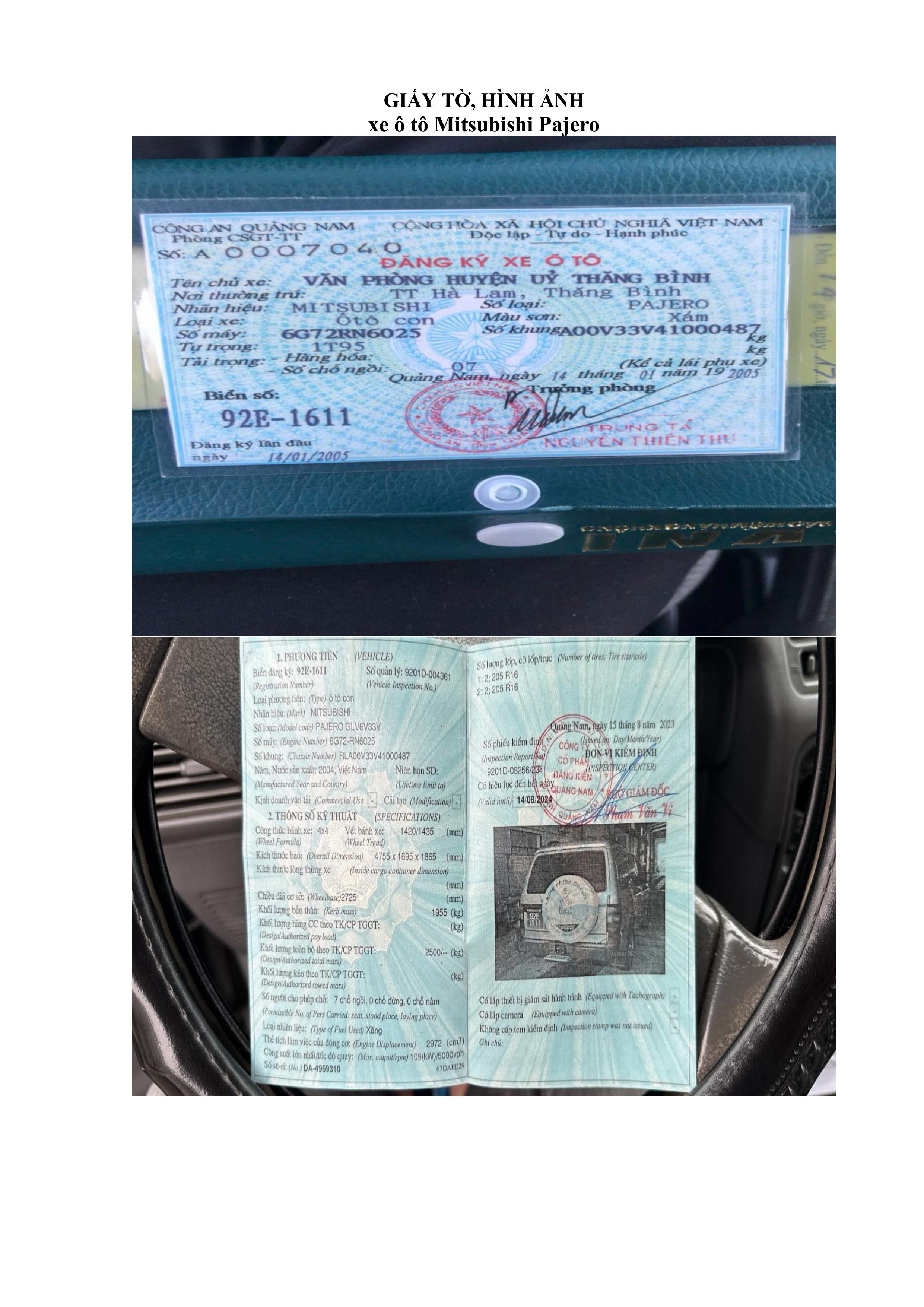 1. Thông tin tài sản đấu giá: Thanh lý xe ô tô biển kiểm soát 92E-1611 nhãn hiệu Mitsubishi loại Pajero GLV6V33V, năm sản xuất 2004, số khung A00V33V41000487, số máy 6G72RN6025. Hiện trang: Tài sản đã qua sử dụng.